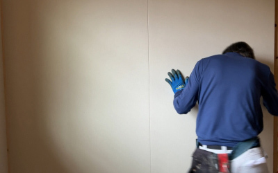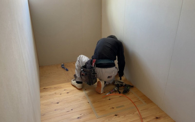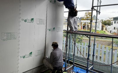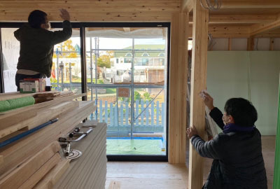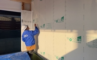 1枚25kg近い面材を見事な連携で張り進めていきます。