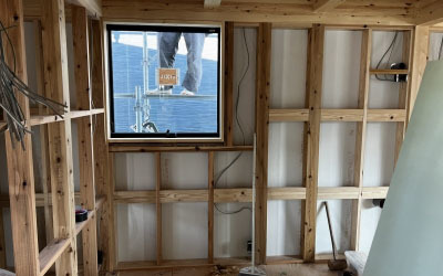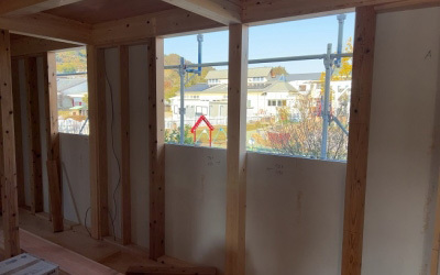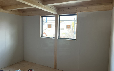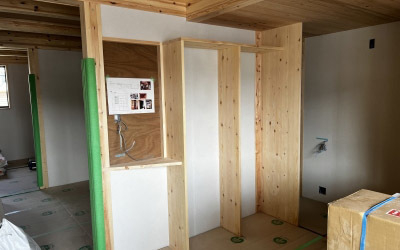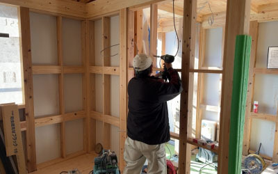 感動の上棟より数日が経過したGarage house。 本格的な大工工事が始まりました! まずは耐力壁の取付です。