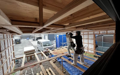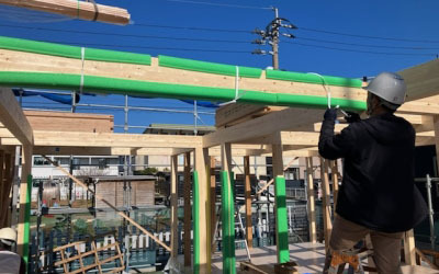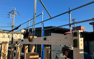 構造用金物を用いて造り上げられる建物。 丁寧に柱と梁を繋ぎ止め、強固な構造体が完成していきます。