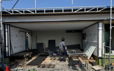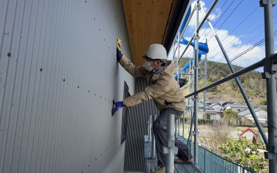 入念な下準備を終えて、いよいよ外壁張りが始まりました! ガルバリウム鋼板材を、窓や屋根の形に合わせて丁寧に加工していきます。