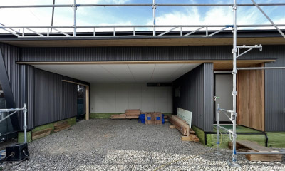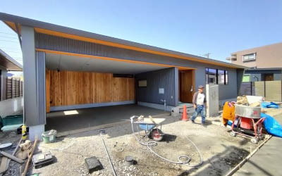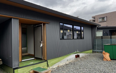 外壁張りを終え、外部の塗装や防水工事が完了したGarage house。