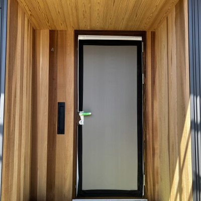 玄関周りのレッドシダー材も銀黒色の外壁と良く合います。