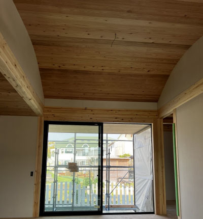 試行錯誤して形を決めたリビングの吹き抜け天井も完了してます。