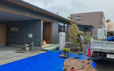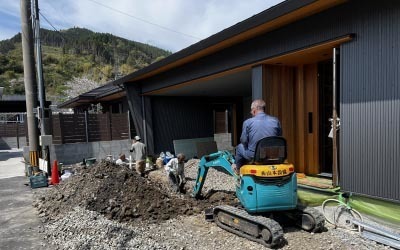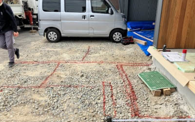 終盤戦へさしかかり沢山のヒトやモノが交わり始める現場。 外構の仕上げに向けた最終調整をおこないました。