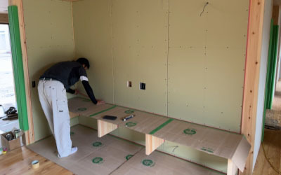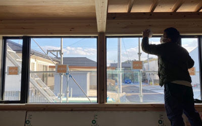 お施主様からお預かりしている大切な建物...汚れや傷がつかないように、スポンジ状のものですかさず丁寧に養生する姿にDさんの愛情と責任感が見て取れます。。