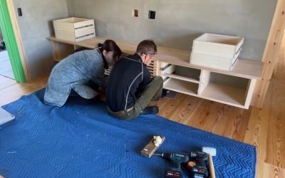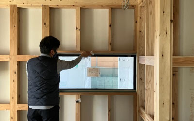 小鬼(子供たち)の居ぬ間に、サッシや造作家具の取り扱い方、メンテナンス方法を実践を交えながら丁寧にご説明。