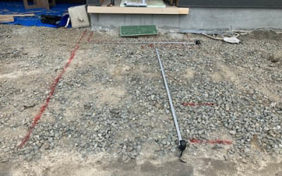 敷地の基準高さ(GL)を元に鋤取りを行い、砕石を敷き 基礎の下地を造ります。