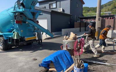 職人さん達は大忙しでGarege内部や玄関アプローチの土間コンクリート打ちをすすめて行きます。