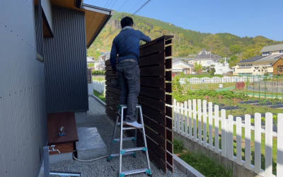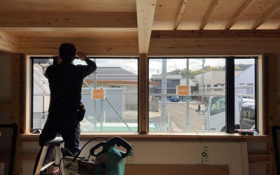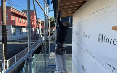 Garage houseの現場を切盛りするD監督。 足場の上からしっかりと状況確認しスムーズに工事は進みます。