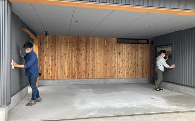 ガレージ内部板張りとガルバのコンビネーションが渋いです。 見惚れながらもキズや汚れがないかもcheck
