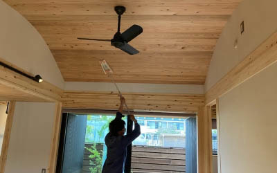 お施主様の直接肌に触れる床や壁はもちろんのこと、天井も徹底的に磨いていきます。 工事期間中も磨きをおこないますが、本日はその締め括り。。