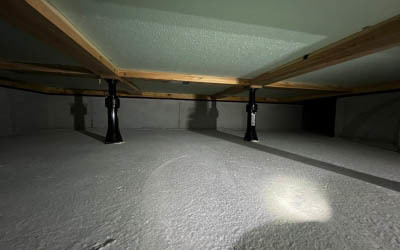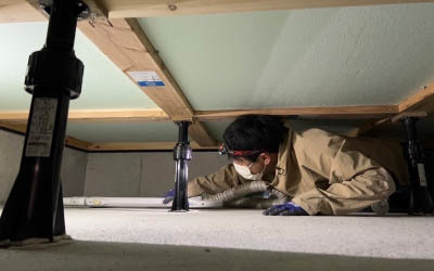 スタッフが磨きを行っているさらにその床下では、現場担当者Dさんが黙々と磨いております。 這いつくばりほふく前進しながらでしか進めない床下。