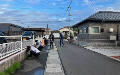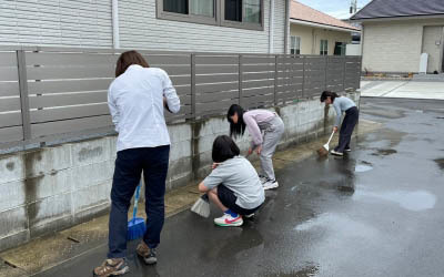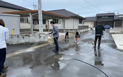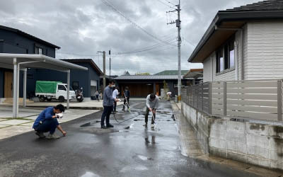 最後はスタッフ全員で現場周辺の磨きをおこないました。 工事期間中はなにかとお世話になった近隣の方々にも感謝の気持ちを込め丁寧に磨きます。