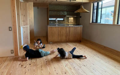 元気一杯の3人のお子様たち!室内に入ってくるなり木の床へゴロリ=3