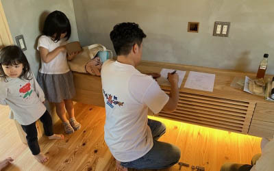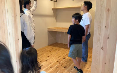 ひとしきり家の心地よさを体感し、お部屋探検が済んだ小鬼ちゃんたちも途中参加。 長男Sくんが兄妹を代表してしっかりと説明をききます。