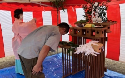 祝詞奏上し工事の無事安全を祈って玉串奉奠。