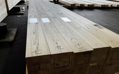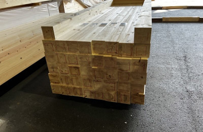 「番付」とは、どの材料をどの場所に配置するかを決めて、 位置がわかるように番号を記していく作業のことをいいます。 横軸方向に「い→ろ→は…」、縦軸方向は「1→2→3…」と、 位置を表す座標があり、例えばい通り・1通りの重なる箇所に配置する柱には、 「いー1」、ほ通り・5通りですと「ほー5」と表記します。