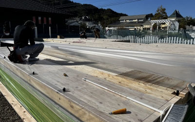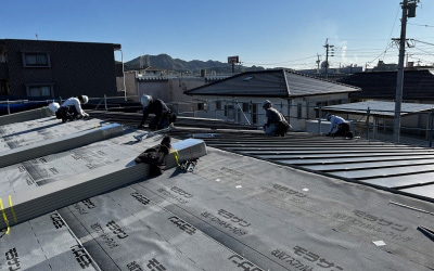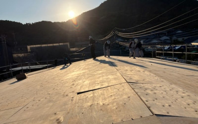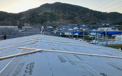 午後からの工事も順調に進み、日が傾く頃には屋根の下地ができあがりルーフィングで雨仕舞い。 これで雨から降り込まれる心配はなくなりました。