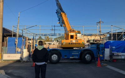 朝礼にて本日の工程を再確認し、職人さんと情報の共有を図ります。 早くから駆け付けていただきましたお施主様が見守る中建て方スタートです!