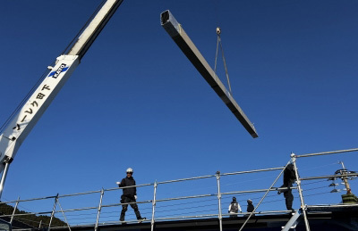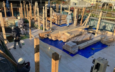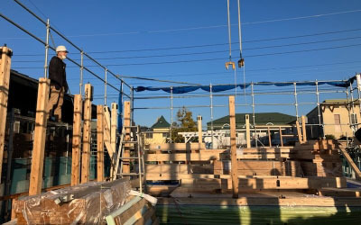 クレーンオペレーター&大工さん達のいきもピッタリ。 指定の位置へ狂いなく材料がはこばれていき待ち受ける大工さんが受け止めます。