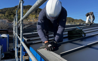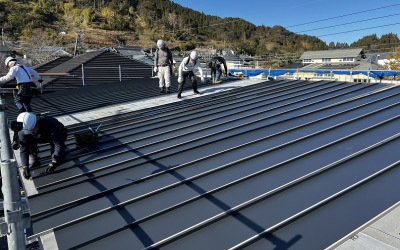 次は、屋根の施工へ。 長いもので7mを超えるガルバリウム鋼板材を慎重に運び入れます。