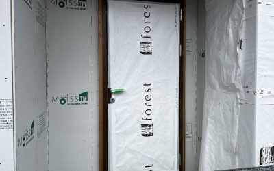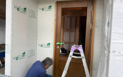 断熱性も高い雰囲気抜群の木製ドアです。 終盤のお披露目までしっかりと養生しておきます。