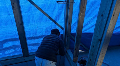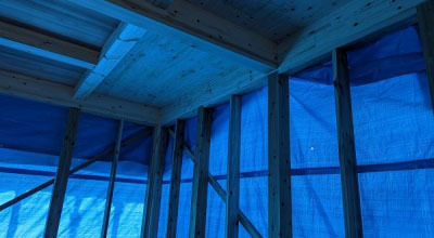 forest木の家は、建て方を終えると同時に 入念にブルーシートを張られ、「碧の家」となります。