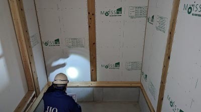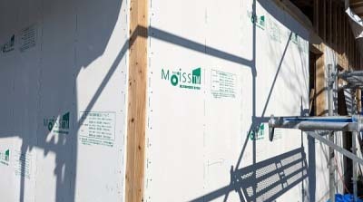 耐震性、防水性に優れた耐力面材用のモイス。 ただ非常に重く、施工は大変となるのですが…。