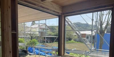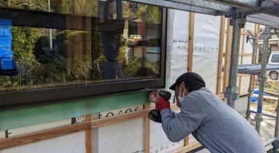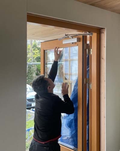 玄関ドアもサッシも最終調整が終わり、ガラス越しの景色が広がります。