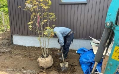 家を彩る木々も、位置や向きを微調整しながら植えられていきます。