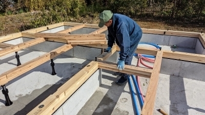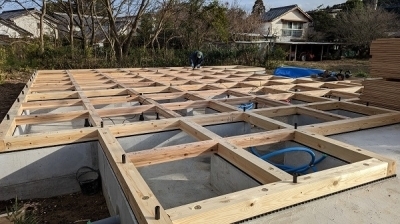 開始から半日、しかりとした床組が組み上がりました。 これから長い間「hang out」の「縁の下」を守ってくれる部分…。 間違いなく安心して任せられる「力持ち」だと確信して次の作業へ進みます。
