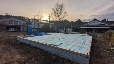 隙間なく施工された断熱材を確認する頃には、辺りは夕暮れとなっていました。 こちらも暖かく「hang out」のお家を包み守ってくれることでしょう。