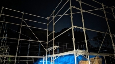 そしてすっかり暗くなった「hang out」 暗闇に、青く浮かび上がるブルーシートの山。 廻りは足場も組み上がり、後は上棟を待つだけとなりました。 準備万端。 「hang out」は棟上げを控え、静かにその時を待ちます。