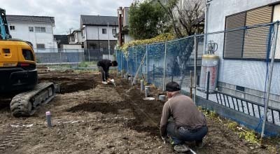 あらかじめ設定したGL高さに合わせて敷地の鋤取りを行います。