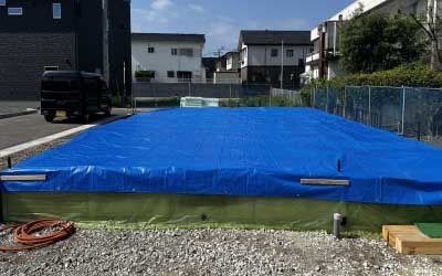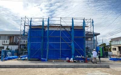 ブルーシートで建物全体を丁寧に包み、雨仕舞いを終えると建て方完了です!