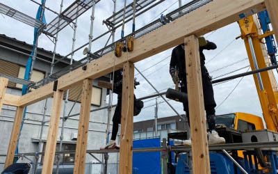 クレーン屋さんがピンポイントで大工さんの手元へと梁を送ります。