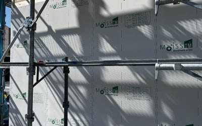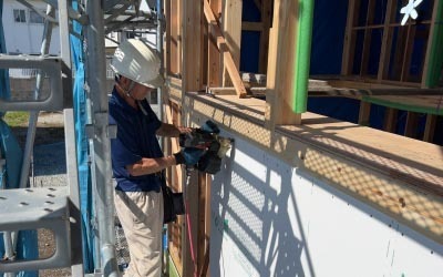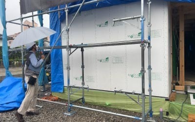 感動の上棟を終え、本格的に動き出しましたHOUSE YKM。 まずは、建物全体を耐力面材「モイスTM」で覆う工程です。