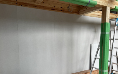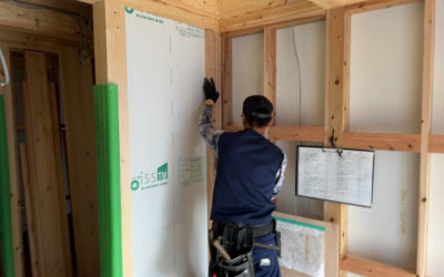 「窓」も入り、順調に進むHOUSE YKM。 内部では壁の仕上げ材「モイス」張りが始まりました!