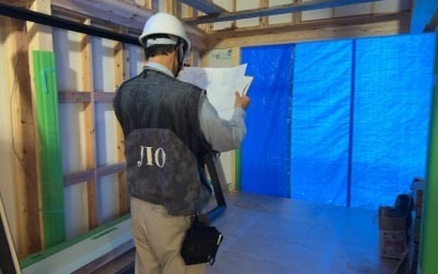 屋根工事を終えると第三者機関による躯体検査を受けます。 耐力面材の配置、釘施工状況の確認。