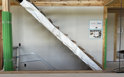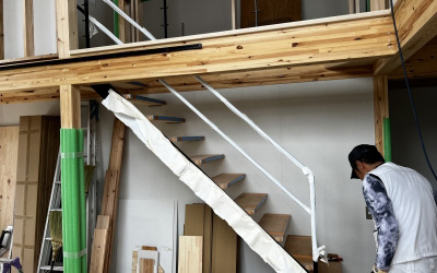 また、床仕上げの最中に階段取付も行いました。 今回はスチール製ササラを採用したスケルトン仕様となります。