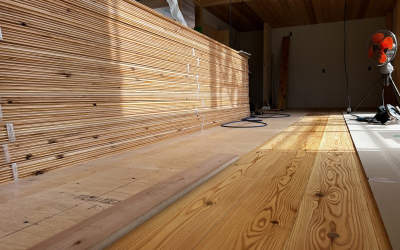 モイス壁が完了すると、天井板の施工へ。 およそ15cm幅の杉板を一枚一枚、慎重に納めていきます。