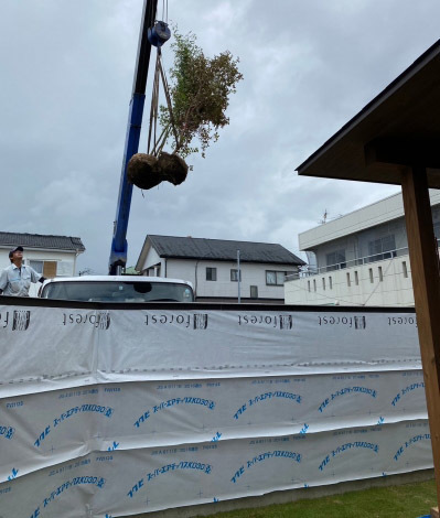 クレーンで慎重に搬入して仮置き。回転させたり傾けたりしながら ダイニングテーブルから、リビングのソファから、テラスのこの位置から... オーナー様の生活をイメージしながら植えていきます。