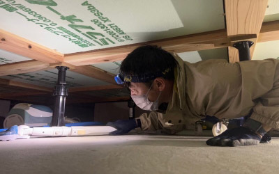 現場担当者自ら床下に潜り、最後の点検と清掃を行います。