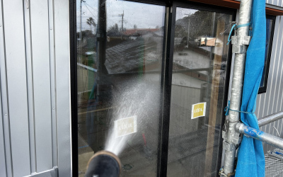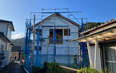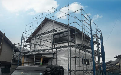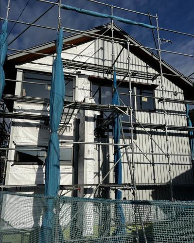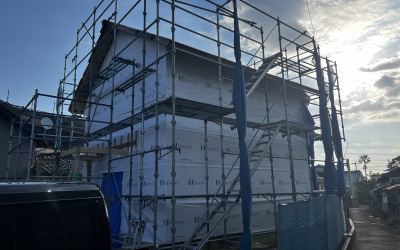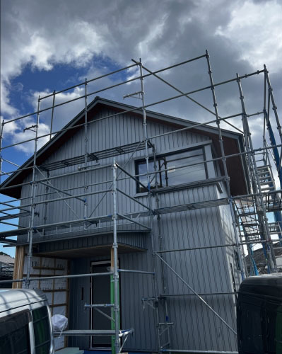 外壁張りを終え、足場解体前に外部の磨きを行いました。