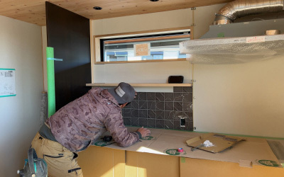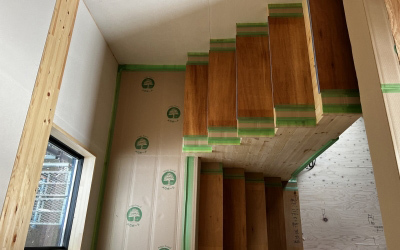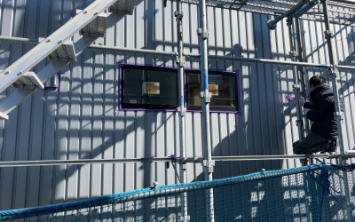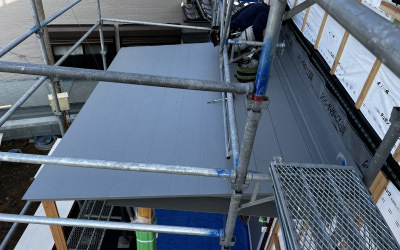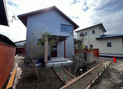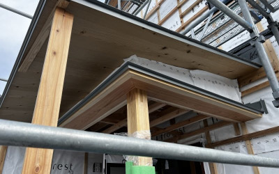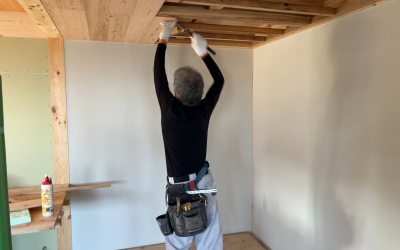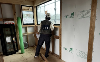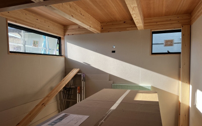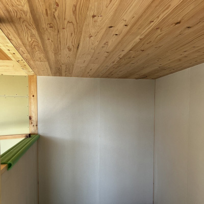 内部での仕上げ工事が進み中、外部では外壁張りを行いました。