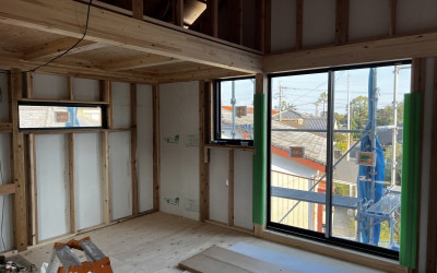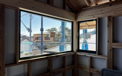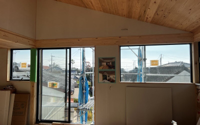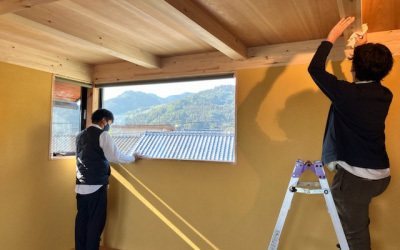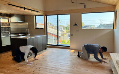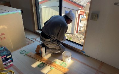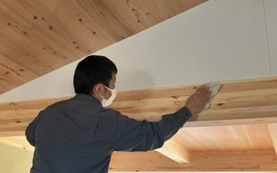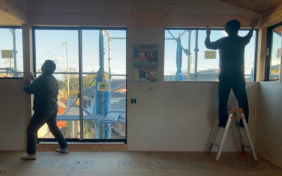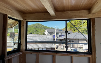 大きく切り取られたサッシの奥に望む景色に、お施主様が過ごされる日々の暮らしに想いを馳せつつ、柱・梁・天井など建物内部を隈なく磨きこんでいきます。