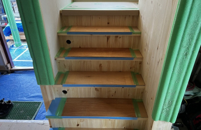 内部では建てた柱に、D監督がしっかり保護材を使用して傷や汚れが付かないよう細心の注意を払います。