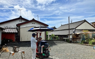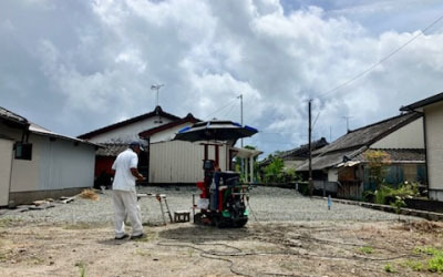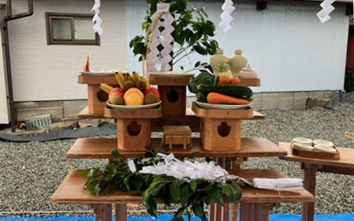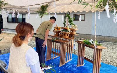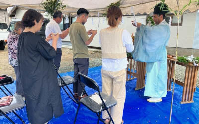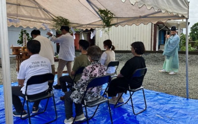 お施主様が集まる時間には何事もなかったかのように見事なまでの夏空へ。 7月吉日 「内海blue」快晴のもと地鎮祭を執り行いました。