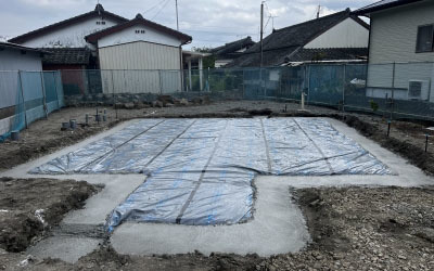 設定GL高さに合わせて鋤取り・砂利敷きを行います。 防湿シートでしっかりと覆い、捨てコンクリート打設へ。