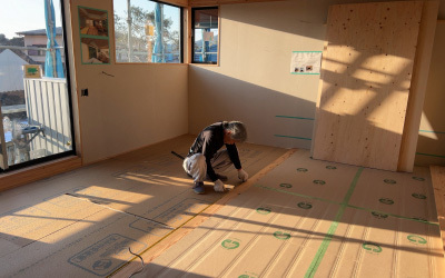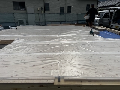 断熱材・床パネルを敷き込み後、透明の養生シートで入念に覆います。